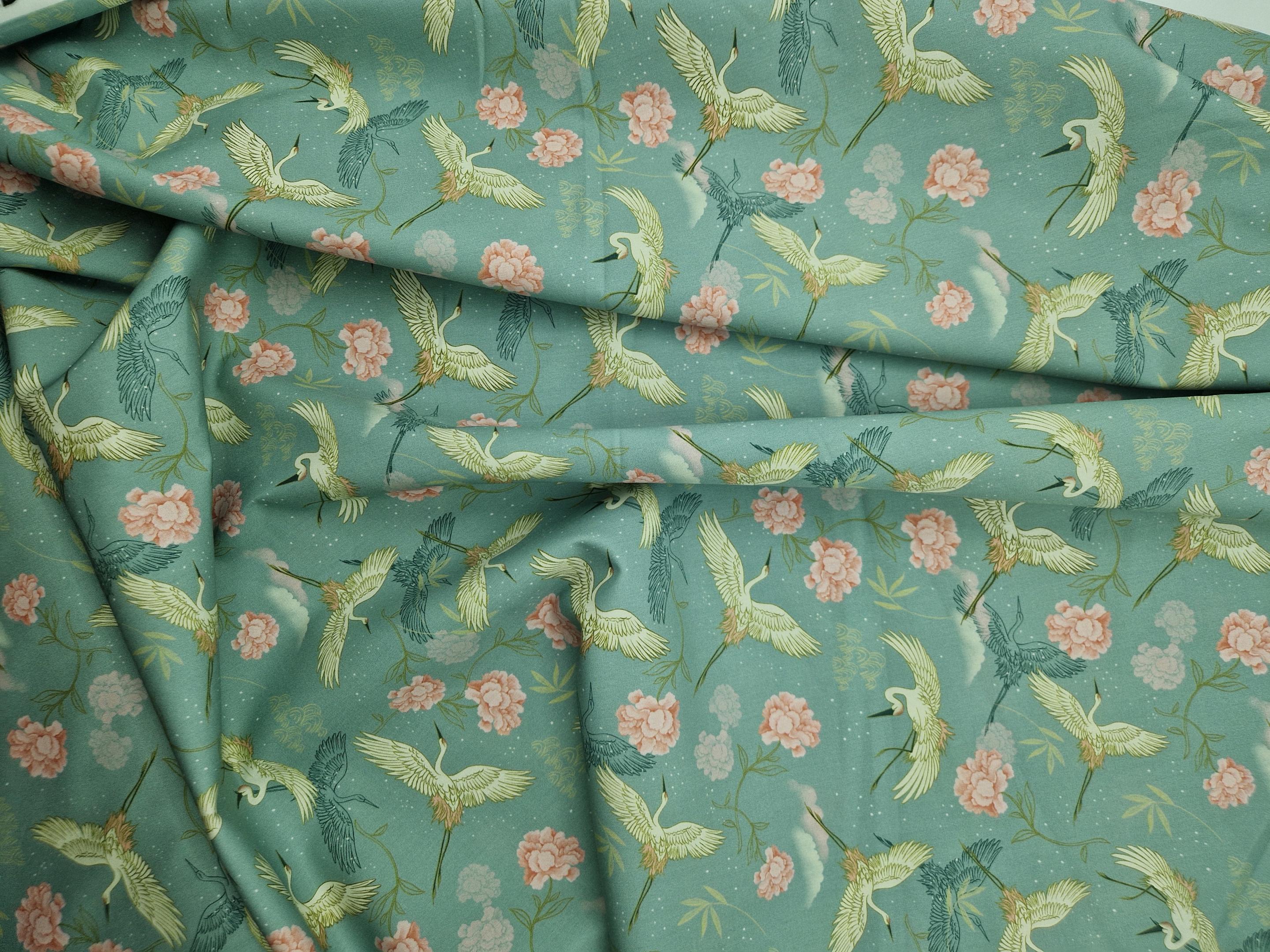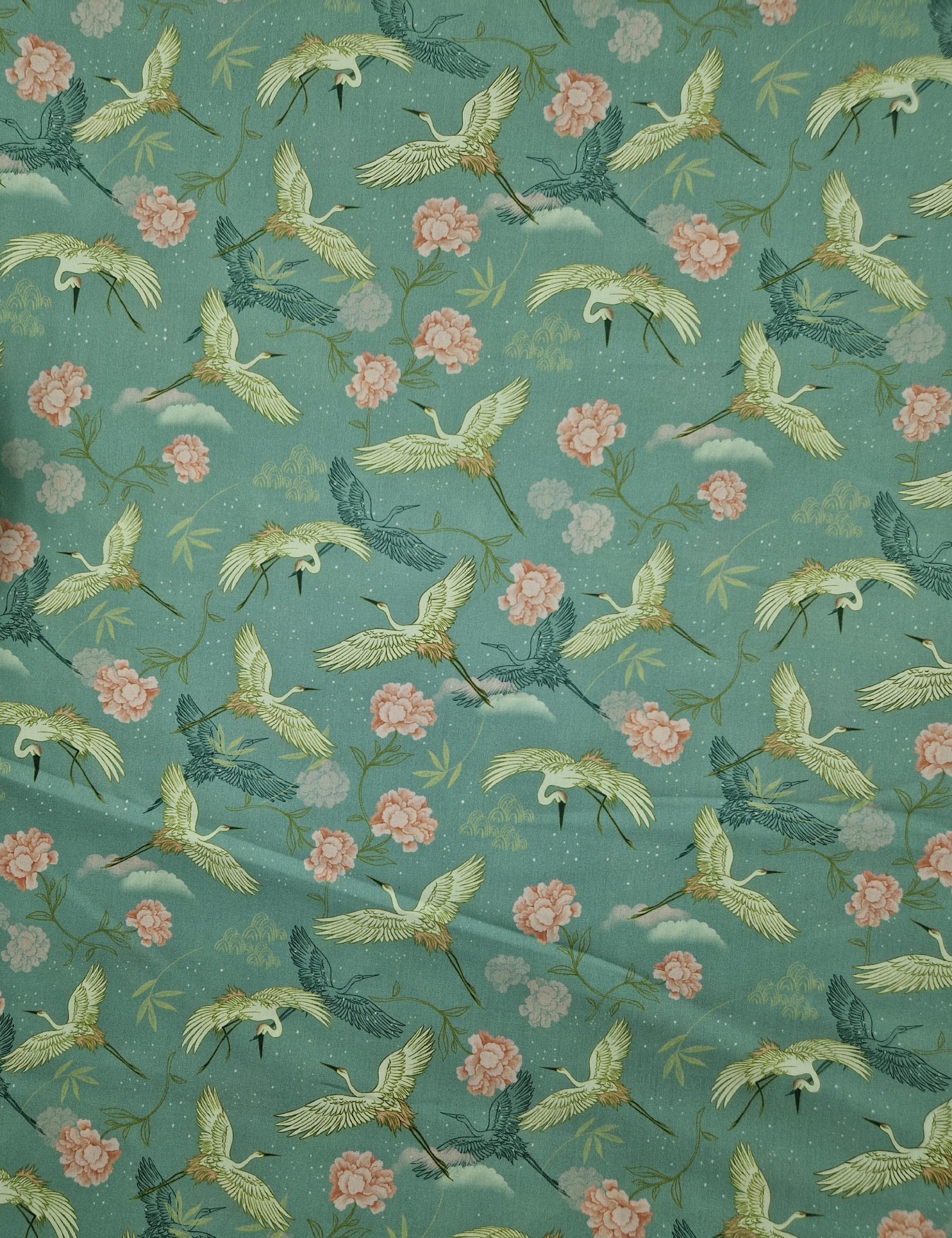 Ce tissu en popeline de coton représentant des oiseaux-grues et des roses dans les tons de beige et rose pâle sur fonds vert tendre.