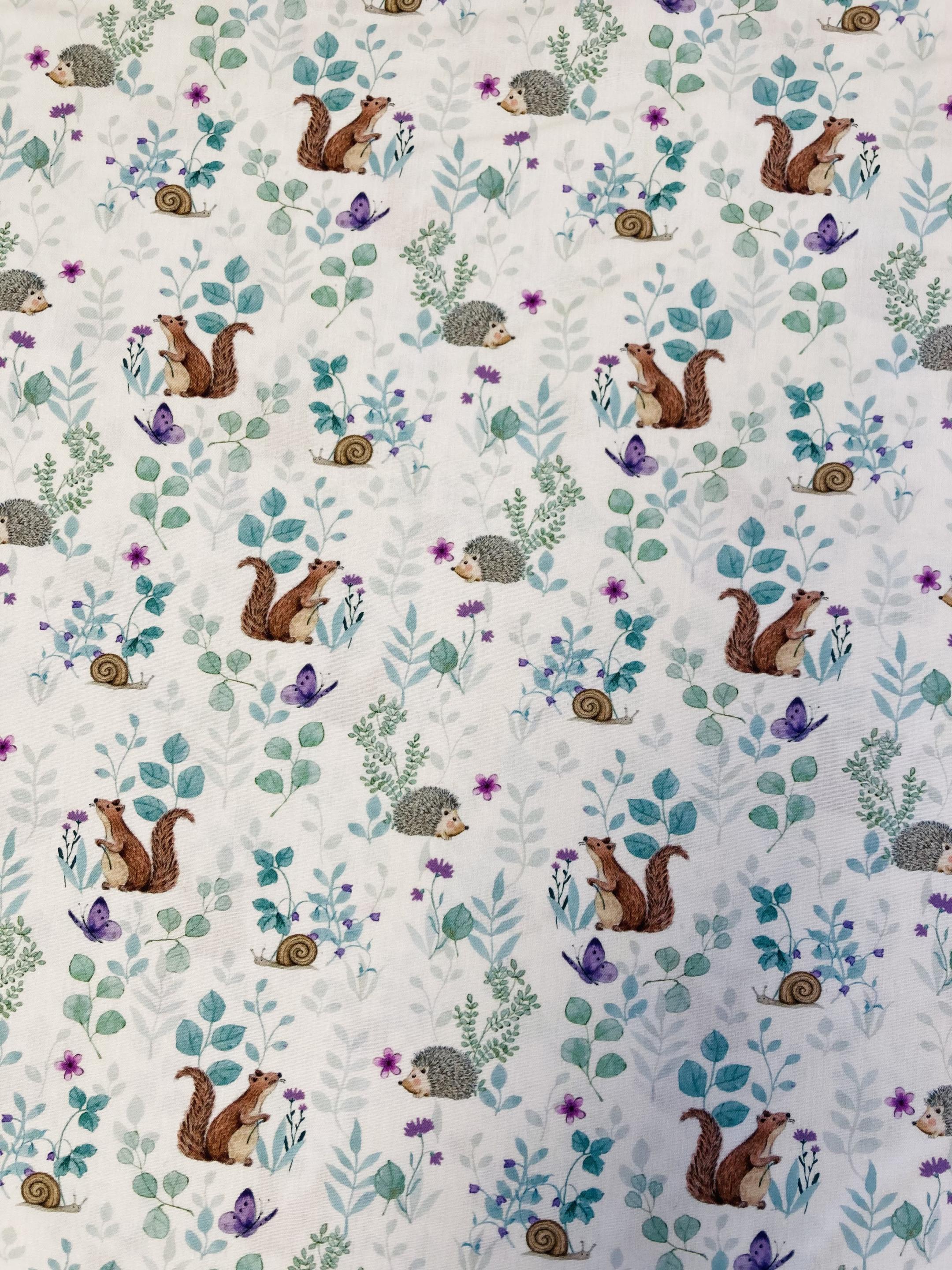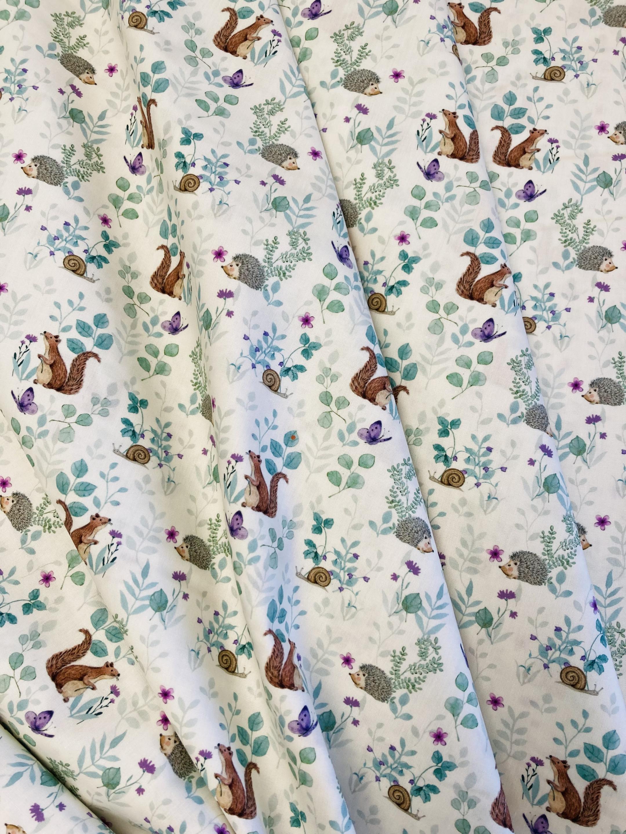 Ce motif représentant les petits animaux de la forêt dans des tons vert, marron, violet sur un fond écru est parfait pour apporter un extra d’énergie et de joie à vos projets de couture.