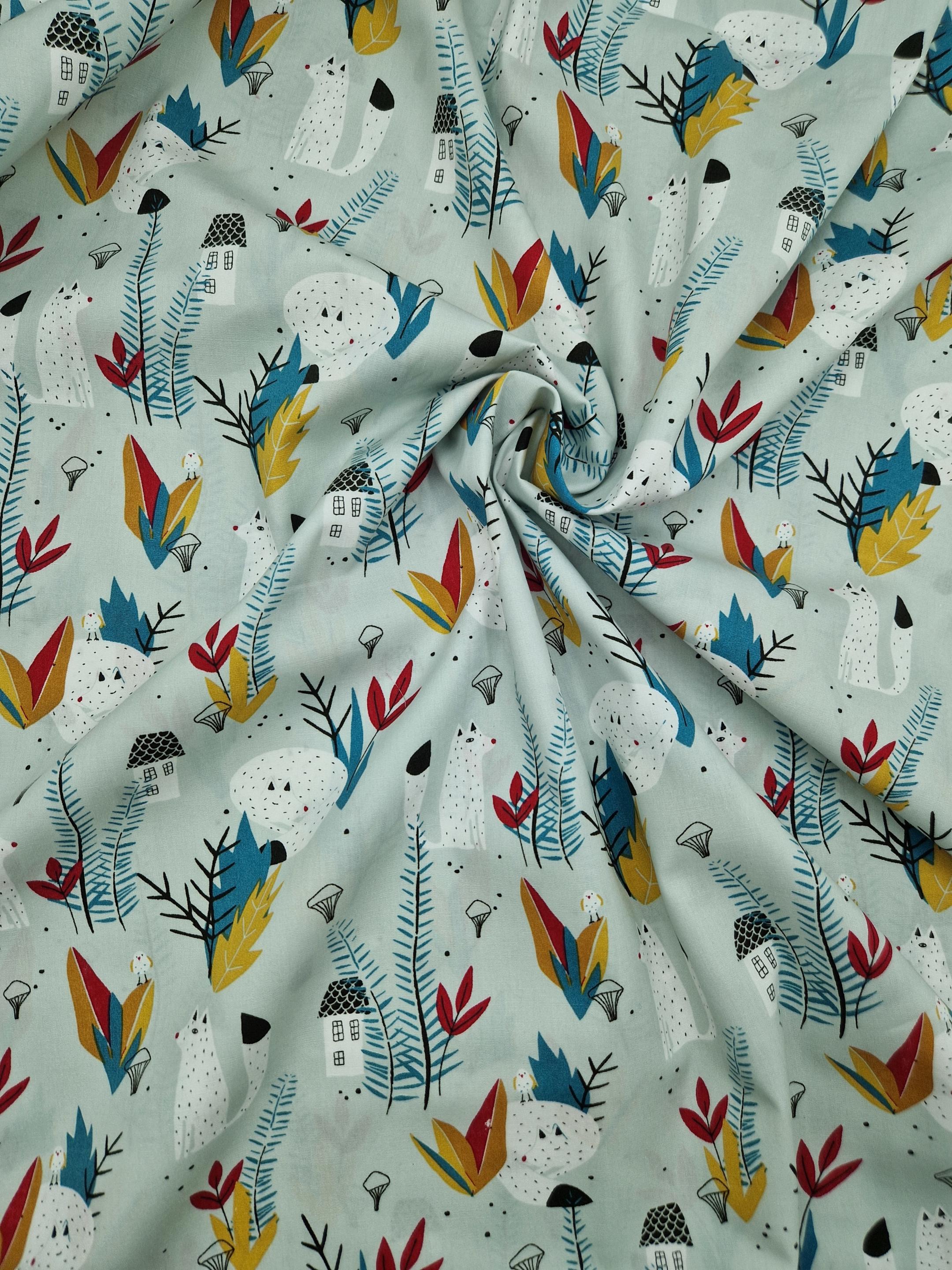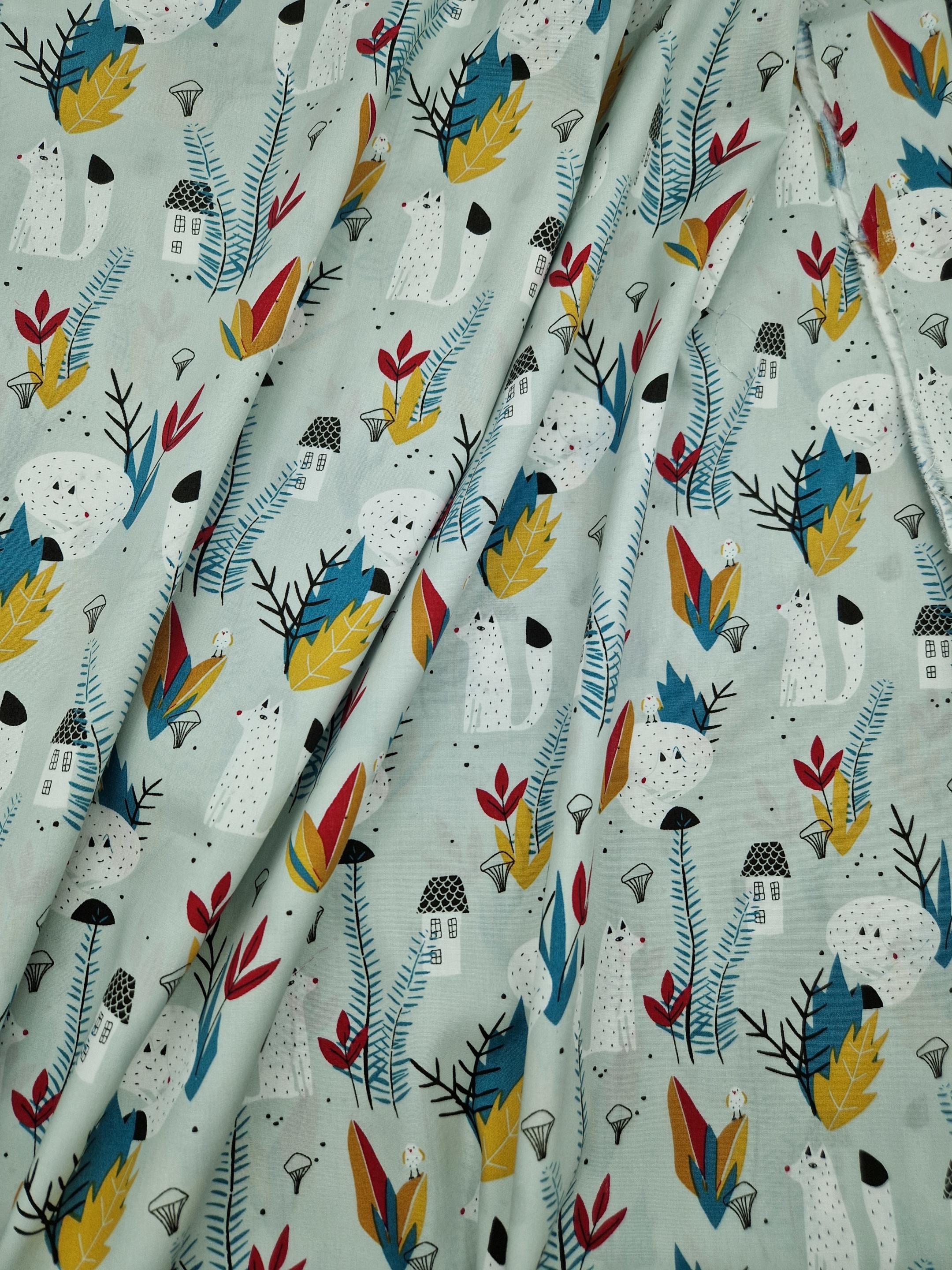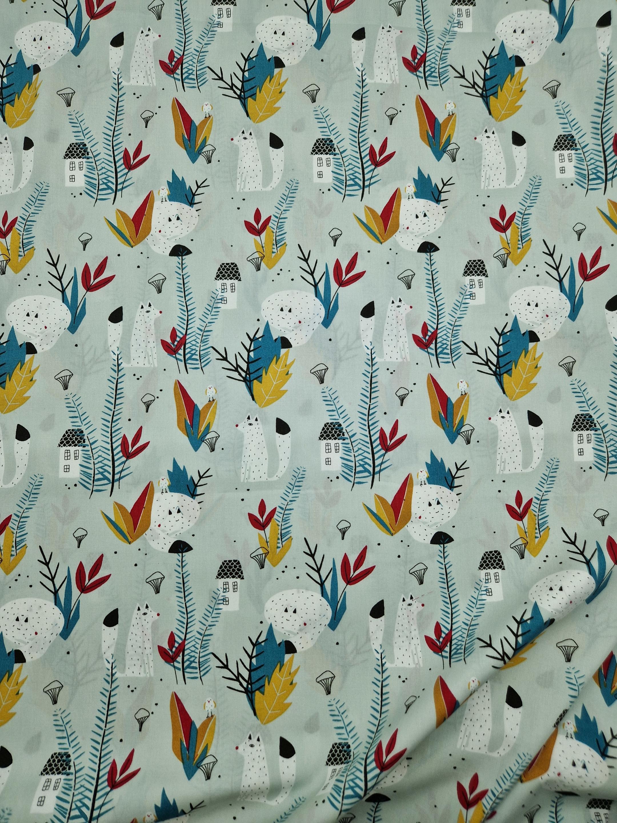 Tissu en coton 100 % imprimé d’un original motif représentant des petits renards entourés de feuillages dans plusieurs tonalités de blanc, bleu, jaune et rouge sur un fond vert pâle.